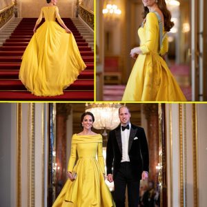 The Princess of Wales, Catherine, stunned royal watchers last night as she stepped into Buckingham Palace’s grand state dining room wearing a dazzling canary-yellow evening gown —…