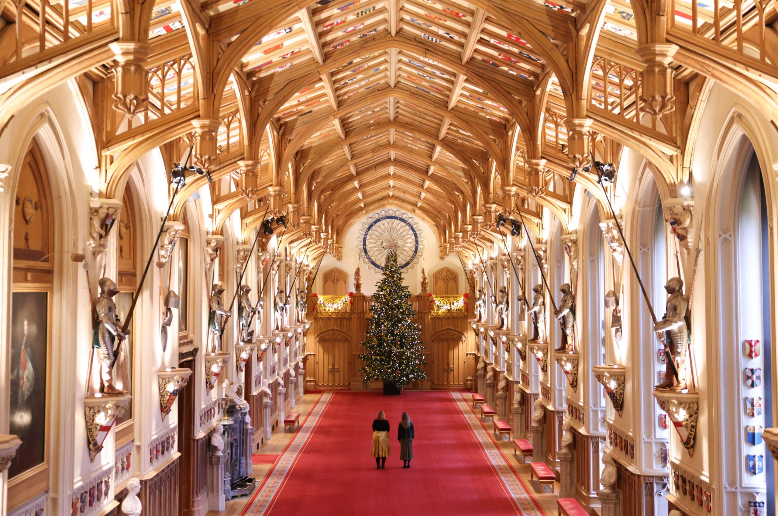 In St George’s Hall, the largest room in the Castle, a towering, 20-foot-high Nordmann fir tree grown in Windsor Great Park will be decked with over three thousand sparkling lights and shimmering green and gold ornaments, while dramatic garlands will adorn the room’s balconies beneath the famous vaulted ceiling.
