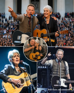 On the warm evening of June 15, 2025, history wasn’t written in ink—it was sung in harmony. Beneath the towering shadow of the Lincoln Memorial, two legends—Bruce Springsteen and Joan Baez—stood side by side, not as performers, but as voices of a nation on the brink. The candlelit crowd of over 50,000 came for a rally for justice. They left changed.